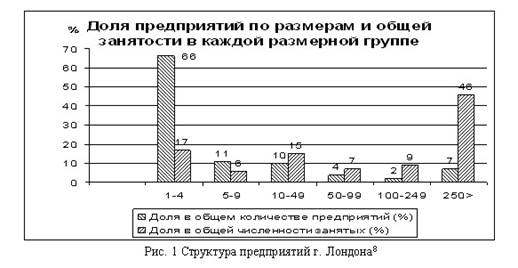 В экономике Лондона сектор МСП занимает доминирующее положение, обеспечивая от 50% до 60% ВВП, производимого городом. По данным за 2006 г. в Лондоне действовало 349513 предприятий, на которых было занято примерно 3,7 млн. работников. Общий объём товарооборот лондонских частных предприятий в 2006 г. достиг £600 млрд. Распределение занятости по размерным категориям предприятий представлено на рис. 1. Несмотря на стабильное, но умеренное развитие городской экономики, в связи с изменениями конъюнктуры и нарастанием конкуренции, около 12-16% предприятий от общего их количества ежегодно учреждаются и примерно 8-12% прекращают свое существование, причем в основной массе это относится к малым предприятиям. По усредненным данным наблюдений за многолетний период, жизненный цикл существования малых предприятий в Лондоне отражается следующими показателями: