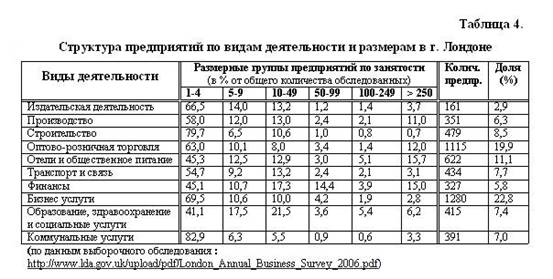 Более подробную картину состояния бизнеса в Лондоне позволяют получить ежегодные отчеты LDA. Так в 2006 г. было проведено очередное исследование (The 2006 London Annual Business Survey - LABS), основанное на результатах обследования 5600 лондонских предприятий. Было установлено, что основное количество МП (с числом работающих до 49 человек) сосредоточено в строительном бизнесе и в сфере услуг. Более крупные предприятия сосредоточены в таких видах деятельности как транспорт и связи, финансы, торговля, в гостиничный и ресторанный бизнес.