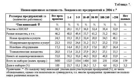 Более высокую значимость низким ценам на товары и услуги придают в основном только малые предприятия, владельцами которых являются представители этнических меньшинств из Африканских и Азиатских стран. Такое явление вызвано тем, что эти предприятия в основном специализируются в розничной торговле, ремесленничестве, оказании бытовых услуг и общественном питании, ориентированных на узкий круг клиентуры в рамках различных этнических диаспор, основная часть членов которых имеет низкие доходы. Рассматривая инновационную активность Лондонских предприятий, отмечается, что в секторе МСП, начиная с 2003 г. растёт удельный вес затрат на научно-исследовательские и опытно конструкторские разработки (НИОКР). В среднем, по обследованным предприятиям, эти расходы в 2006 г. составляют примерно £3000 в год на одного работающего причём, более крупные предприятия расходуют на эти работы значительно больше средств. В целях более эффективного проведения НИОКР, предприниматели всё чаще обращаются к своим поставщикам и клиентам, а так же консультируются со специалистами смежных предприятий для получения необходимой информации и технической помощи. Если в 2003 г. только 15% опрошенных предприятий, при выполнении НИОКР, взаимодействовали с другими предприятиями и научно-техническими организациями, то в 2006 г. их количество возросло до 40%. В 2006 г. 46% Лондонских предприятий применило в своей деятельности различные организационные, технические и технологические инновации (таблицы 7, 8). В их числе только 19% предприятий применили широкий комплекс инновационных решений в производстве продуктов и в предоставлении услуг, 17% предприятий ограничились применением конструктивных новшеств и только 11% использовали технологические нововведения.