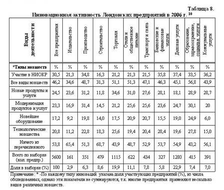 В среднем 46% Лондонских МСП успешно ведут работы по внедрению всевозможных новшеств, которые в меньшей степени связанных с научно-техническими разработками и базируются на уже апробированных достижениях науки и техники. Это производство новых продуктов и услуг, модернизация ранее выпускавшейся продукции, применение нового оборудования и более совершенных технологий. предприятий. В этом отношении, наибольшую активность проявляют предприятия с числом занятых свыше 10 человек, причем 66% крупных предприятий (с числом занятых 250 и более человек) осуществляют весь комплекс таких мероприятий, т.к. обладают для этого достаточными ресурсами. Рассматривая эти процессы применительно к различным видам деятельности, можно заметить что наибольшее количество предприятий (51-56%), планомерно внедряющих подобные новшества сосредоточены в торговле, гостиничном и ресторанном бизнесе, образовании, здравоохранении и социальных услугах (более подробно см. табл. 8 ).