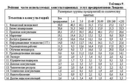 Организация поддержки развития сектора МСП, в основном, возложена на «Лондонское агентство развития» (- LDA), которое частично финансирует и координирует деятельность «Лондонской службы поддержки МСП» (The Business Link London – BLL, являющейся частью «Национального агентства поддержки МСП» (Business Link – BL). Служба BLL имеет свои отделения во всех районах города и оказывает круглосуточную поддержку предпринимателям в формате «одного окна», а также предоставляет экстренные консультации по Интернету и телефону. С апреля 2006 г., функции оператора агентства BL в Лондоне, по конкурсу выиграла фирма «Serco Limited», подписав контракт на 3 года с агентством LDA, общей стоимостью £60 млн. Этот контракт предусматривает оказание всесторонней поддержки стартующим, молодыми действующим МСП, расположенным в Лондоне. Со своей стороны служба BLL будет бесплатно оказывать информационные, диагностические и посреднические услуги предпринимателям (Information, Diagnostic and Brokerage - IDB) в соответствии с их потребностями. Рассматривая данные о видах и группах пользователей различными консультационными услугами (табл. 9), можно заметить, что наиболее востребованными для малых предприятий с числом занятых до 49 работающих, являются консультации по финансовому менеджменту, бизнес-планированию, по правовым вопросам, маркетингу, доступу к финансам и по информационным технологиям. Для предприятий размером от 50 до 249 работающих, наиболее востребованными являются консультации по финансовому менеджменту, бизнес-планированию и по правовым вопросам, а также информационным технологиям и переподготовке рабочих. Причем для средних и крупных предприятий проблемы переподготовки рабочих и обучения руководящих работников становятся всё более значимыми. Для крупных предприятий (с числом занятых более 250 чел.) наибольшую важность приобретают консультации по бизнес-планированию, правовым вопросам, маркетингу, информационным технологиям переподготовке рабочих и по совершенствованию работы управленцев. Таким образом, рейтинг наиболее востребованных консультационных услуг практически исчерпывается первыми 9 , приведенными в таблице 9.