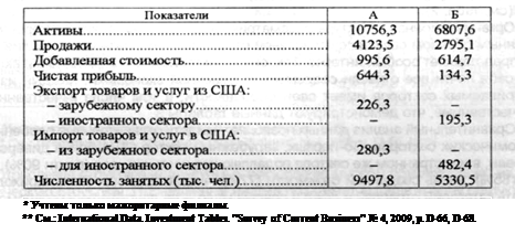 Таблица 2 - Основные показатели деятельности подразделений зарубежного сектора США (А) и иностранного сектора в США (Б) в 2006 г. (млрд. дол.)