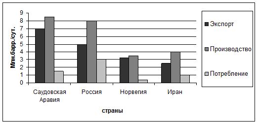 Рисунок 1 – Экспорт, производство и потребление нефти в странах мира в 2003 г.
