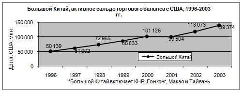 На рис. 1. приведены графики, отображающие объем товаров и услуг, продаваемых Китаем Соединенным Штатам. Цифры относятся не только собственно к Китаю (Китайской Народной Республике, сокращенно КНР), но и к Большому Китаю (включая Гонконг, Тайвань и Макао, за исключением Сингапура). Приведенные данные свидетельствуют об усилении процесса интеграции экономических систем Китая и подтверждают обоснованность основной претензии со стороны U . S . China Business Council , американской торговой группы, в состав которой входят основные американские экспортеры товаров в Китай. Суть претензий заключается в том, что данные по КНР искажены, так как не учитывают роли Гонконга как перевалочного пункта. (То есть немалая часть экспорта из Китая идет через Гонконг, и большое количество товаров, экспортируемых США и предназначенных для материкового Китая, разгружается в Гонконге.) «Мы включаем услуги, потому что, в отличие от сферы продажи товаров, где наблюдается хронический дефицит, в области торговли услугами (перевозки и консультации) США располагают значительным активным балансом»»[15, c. 38].