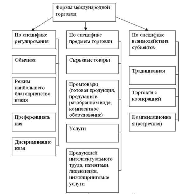 Формы международной торговли можно систематизировать по трем направлениям. Критериями определения форм является регулирование, предмет торговли, взаимодействие субъектов международной торговли.