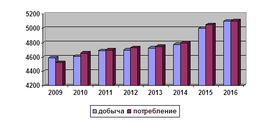 Рис. 3. Прогноз мировой добычи и потребления нефти до 2016 г.