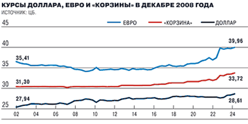 Рис. 1 – Курсы доллара, евро и «корзины» в декабре 2008г (источник: ЦБ РФ).