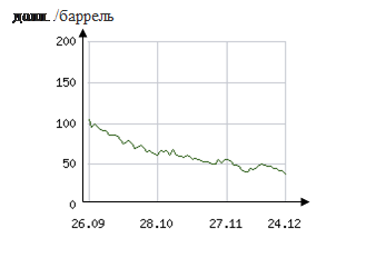 Отток же частного иностранного капитала из РФ в январе-ноябре 2008г. составил около 80 млрд долл. Об этом сообщил первый заместитель Председателя Банка России Алексей Улюкаев, отметив, что по итогам 2008г. он может достичь 100 млрд долл.[12] Только в октябре из России ушли 50 млрд. долларов (для сравнения: за весь кризисный 1998г. из страны убежали лишь 21,7 млрд. долл.), вдобавок стоимость нефти на мировых рынках упала ниже 55 долл. за баррель.[13] На рисунке (см. рис. 2) приведена динамика цен на нефть за последние три месяца 2008 (на 24.12.08 до 36,61 долл. за баррель)[14] .