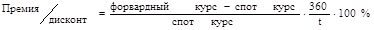 Форвардный валютный контракт – обязательное для исполнения соглашение о покупке или продаже в определенный день в будущем определенной суммы иностранной валюты. Валюта, сумма, курс и дата платежа фиксируются в момент заключения сделки. Срок сделок: от трех дней до пяти лет. Наиболее распространенные сделки на срок 1, 3, 6 ,12 месяцев. Теоретически форвардная цена валюты может быть равна спот цене, но на практике это встречается редко. Если форвардный курс больше спот курса, валюта котируется с премией, если меньше, то с дисконтом. Размер дисконтов или премий вычисляется по формуле: