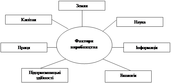 Сучасна вітчизняна і світова економічна наука до складу факторів виробництва відносить: працю, капітал, землю, підприємницькі здібності, науку, інформацію, екологію (рис. 1).