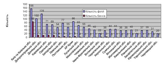 Разом із тим, якщо поглянути на кількість банків та їх філій у розрізі регіонів (рис. 2.2), то бачимо, що фактично кожен регіон характеризується досить високою концентрацією банківських установ, які в основному представлені філіями банків, майже усі головні офіси банківських установ розташовані у м. Київ.