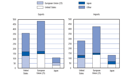 Прослідкувавши динаміку імпорту за 2003-2005 рік, можна з впевненістю сказати, що його обсяги збільшуються, у 2003 році імпорт країни становив 520, 79 млрд. дол., у 2004 - 611,32 млрд. дол., а у 2005 вже 676, 21 млрд. дол. Абсолютна зміна обсягу імпорту за 2003-2004 рік становить 90,53 млрд. дол., відносний приріст + 17,4 %. Щодо зміни імпорту у 2005 році, його абсолютний приріст становив 64, 89 млрд. дол., а відносний приріст +10,6%. [10]Зовнішньоторговельний обіг (2005) = ЕХ+ІМ= 587,26 + 676, 21 = 1263,47 млн. дол.