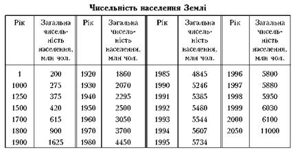 У табл.1 наведено дані про збільшення чисельності населення Землі від появи людини до наших часів, а також прогноз чисельності населення планети у 2050 р.