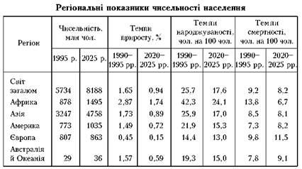 Найвищими темпами збільшується населення Африки - щоро-ку на 3%. Кенійська жінка у середньому народжує 7 разів. “Демо-графічному вибуху” сприяють не лише високі темпи народжуваності, а й загальмовані темпи смертності населення планети. Очікується, що у 2025 р. чисельність населення становитиме 8,5 млрд чол. (табл.2).