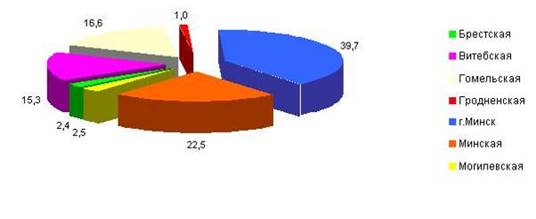 Структура иностранных инвестиций по областям Республики Беларусь за январь-сентябрь 2008 г. приведена в диаграмме: