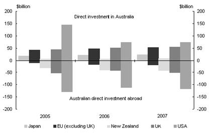 Діаграма 1 зображає недавні тенденції в FDIпотоки між Австралією і її п'ятьма найбільш важливими партнерами FDI: США, Сполучене Королівство (Великобританія), Японія, Нова Зеландія і Євросоюз (ЄС) (окрім Великобританії).США- австралійське єдине найбільше джерело внутрішнього FDI і найголовніше місце призначення для Австралійського FDI за кордоном. Майже чверть всього FDI в Австралію прибуває з США і приблизно 40 відсотка всіх Австралійських прямих інвестицій за кордоном витікає в США. У 31 грудні 2007, Австралія мала на $42.7 мільярдів більше прямих інвестиції в США, ніж США мали в Австралії.Великобританія традиційно була австралійським головним джерелом FDI. В кінці 2007, $54.0 мільярдів, або приблизно 17 відсотків FDI в Австралії походили з Великобританії. Рівень австралійських прямих інвестицій в Великобританію ріс стрімко в 2007 до $53.5 мільярдів.Рівень Японського FDI в Австралії в 2007 склав $23.5 мільярдів. Проте, Австралійський FDI в Японію був на дуже низькому рівні.Рівень Австралійських прямих інвестицій до Нової Зеландії зріс в 2007 до $41.1 мільярдів. Нові зеландські прямі інвестиції до Австралії зросли до $7.9 мільярдів в 2007.Рівень прямих інвестицій ЄС (виключення Великобританія) в Австралійську економіку зріс в 2007 до $53.1 мільярдів. Австралійські прямі інвестиції в ЄС майже подвоїлись за останні два роки до $20.2 мільярдів в кінці 2007.
