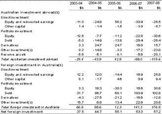 Таблиця 1 відображає розподіл потоку іноземних інвестицій за минулі п'ять років, зважених статистикою ABS. Вливання $176.8 мільярдів в 2007-08 є найбільшим коли-небудь річне вливання іноземних інвестицій в Австралію. Відтік $119.6 мільярдів в 2007-08 є найбільшим коли-небудь річний відтік австралійських інвестицій за кордон. Для наглядного прикладу, дану таблицю краще розглянути у графічному вигляді.
