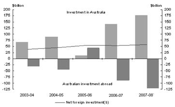 В той же час потік австралійських інвестицій за кордон склав $923.3 мільярдів. Це представляє збільшення на $155.1 мільярдів (20 відсотків) рівня 30 червня 2007. FDI дав звіт про $318.8 мільярдів загального потоку інвестицій за кордоном, збільшення $44.4 мільярдів (16 відсотків) від 30 червня 2007.