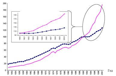Рисунок 1. Динамика физических объемов мирового производства и экспорта в 1950-2000 гг.