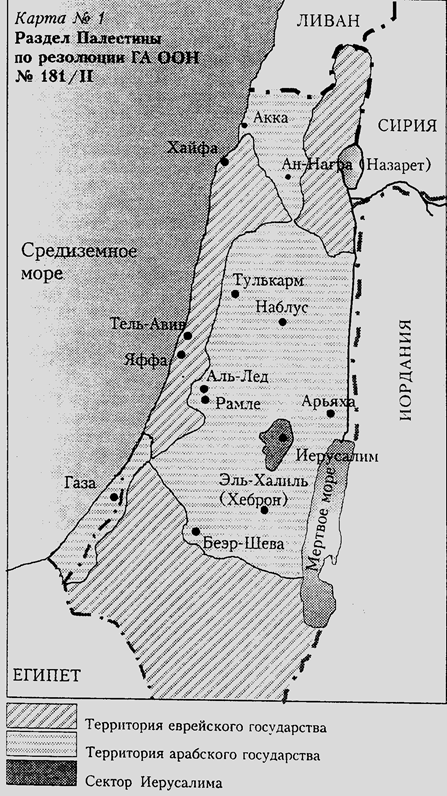 На эти предложения арабы ответили решительным отказом, сионисты воспринята их с большим реализмом. Они согласились с правом на создание еврейского государства на части территории Палестины, которое впервые было признано организацией, выступавшей в тот момент источником норм международной жизни. Доклад UNSCOP обсуждался на Генеральной Ассамблее 29 ноября 1947 г. и был одобрен 33 голосами (включая голоса Соединенных Штатов, Советского Союза и Франции), при 13 голосах против (голосах арабских государств, Индии и Греции) и 10 воздержавшихся (среди которых — Великобритания). В конечном счете после долгих прений Генеральная Ассамблея ООН приняла резолюцию 181 (II) о прекращении действия мандата и разделе страны на два самостоятельных демократических государства — арабское и еврейское. Учитывая, что проблема святых мест Иерусалима на протяжении десятилетий являлась дополнительным источником конфликта в Палестине, а также религиозное значение Святого города для христиан всего мира, резолюция предусматривала выделение Иерусалима и его окрестностей в специальную зону под международным контролем[9] .