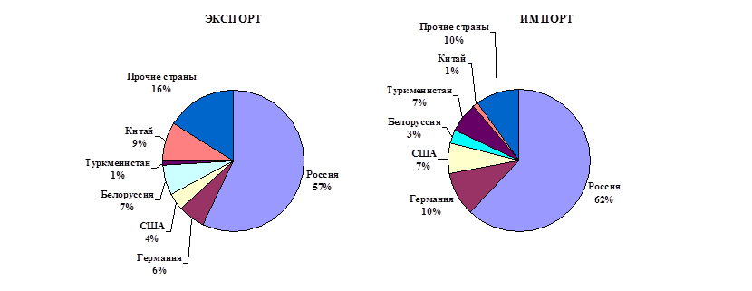 Основные экспортные поставки товаров и услуг осуществлялись в страны Европы(20,5% общих объемов экспорта продукции в страны дальнего зарубежья) и Азии(18,6%).В значительных объемах товары экспортировались в Китай($383,6 млн., или12,7% общих объемов экспорта в страны дальнего зарубежья), в Германию $200,9 млн. (6,7%), в Турцию $195,3 млн. (6,5%), а также в Польшу $173,5 млн. (5,8%).
