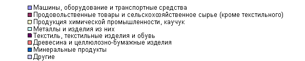 В товарной структуре импорта России из стран дальнего зарубежья в I квартале 2009 г. по сравнению с I кварталом 2008 года сократился удельный вес машин, оборудования и транспортных средств, минеральных продуктов, увеличилась доля текстиля, текстильных изделий и обуви, продовольственных товаров и сельскохозяйственного сырья (кроме текстильного), продукции химической промышленности и каучука, металлов и изделий из них и древесины и целлюлозно-бумажных изделий.