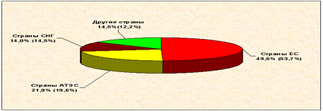 В географической структуре крупнейшим экономическим партнером России остается Европейский союз (ЕС), на долю которого в I квартале 2009 г. приходилось 49,6% российского товарооборота (в I квартале 2008 года – 53,7 процента). В I квартале текущего года товарооборот со странами-членами ЕС снизился на 49,0%, в том числе экспорт – на 52,9%, импорт – на 38,6 процента.