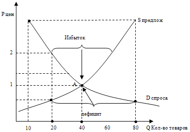 На графике видно, что при цене товара в 1 условную единицу количество товаров - 40 условных штук, при цене в 2 условные единицы, производители предложат гораздо больше товаров – 60. при цене в 3 единицы – и вовсе предложение увеличится. Но что со спросом в этой ситуации? Он уменьшится, т.е. только 10 штук товаров готовы купить и наоборот: при цене меньшей 1, готовы купить более 80 штук товара. Точка А – равновесная точка, т.е. интересы производителей и покупателей совпадают (они готовы купить именно за ту цену, за которую хотят продать производители). Но когда цена растёт, спрос падает – происходит перенасыщение рынка, т.е. избыток товаров. А когда цена падает – возникает дефицит (спрос превышает предложение). Разбалансированное состояние рынка бывает недолго, а стремится к равновесному состоянию.