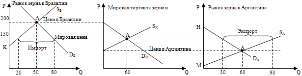 Кривые спроса на зерно в Бразилии – Dб, в Аргентине – Da. Допустим, что эти страны не торгуют друг с другом, а равновесные цены внутри стран – в Аргентине 120 долл. за 1 т., в Бразилии 200 долл. Так как цена в Бразилии выше, чем в Аргентине, то аргентинским производителям будет выгодно продавать своё зерно Бразилии, а бразильским потребителям выгодно покупать его, т.к. оно дешевле своего. Разница в ценах позволяет импортировать и экспортировать товары, но уровень мировой цены тоже имеет значение. Аргентинским производителям будет выгодно продавать своё зерно, если мировая цена будет больше их внутренней, т.е. больше 120 долл. Чем выше будет мировая цена, тем больше будет предложение от аргентинских производителей, но цена внутри страны тоже будет расти, а значит, спрос в Аргентине сократится. На графике 3 видно, что при цене 150 долл. в Аргентине готовы купить только 30 т. зерна, а производители предлагают 90 т., значит этот излишек 90 – 30 = 60 т. они продадут (экспортируют).