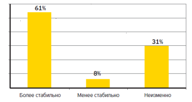Так же, по мнению респондентов, стабильность положения России будет возрастать (61%) либо останется неизменной (31%). Только 8% участников исследования опасаются, что стабильность положения России будет снижаться в дальнейшем.