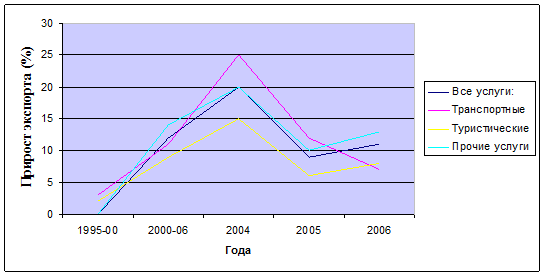 По данной диаграмме можно сделать выводы о том, в период с 1995 по 2004 гг. для всех видов услуг были характерны довольно высокие темпы прироста экспорта, которые достигли своего максимума в 2004г., затем резко снизились к 2005 году, после чего вновь стали увеличиваться. Наибольшими темпами прироста в период с 1990 по 2005 гг. характеризовались транспортные услуги. Пик их прироста приходится на 2004г., когда соответствующий показатель достиг 25%. Однако с 2004 по 2006 гг. темпы прироста экспорта данного вида услуг характеризуются снижением, в то время в динамику прироста экспорта других видов услуг отмечается обратная ситуация.