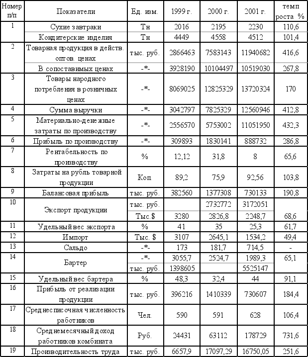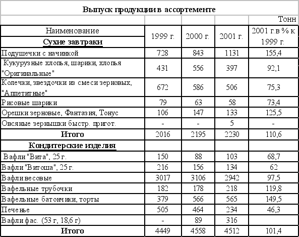 В таблице 4.2.1. приведена динамика объемов производства предприятия за 1999 –2001гг. За этот период комбинат значительно увеличил производство сухих завтраков (на 10,6 %), а выпуск кондитерских изделий по сравнению с 1999 годом вырос незначительно, а по сравнению с 2000 годом сократился на 46 тонн. Если рассматривать ассортимент продукции, то можно отметить, что значительно расширилось производство подушечек с начинкой и зерновых орешков, а также вафельных трубочек, вафельных батончиков и тортов, в то время как объемы производства многих других изделий были значительно сокращены (печенье - на 53,7 %, вафли «Витоша» и «Вита» - на 38% и 31,3% соответственно).