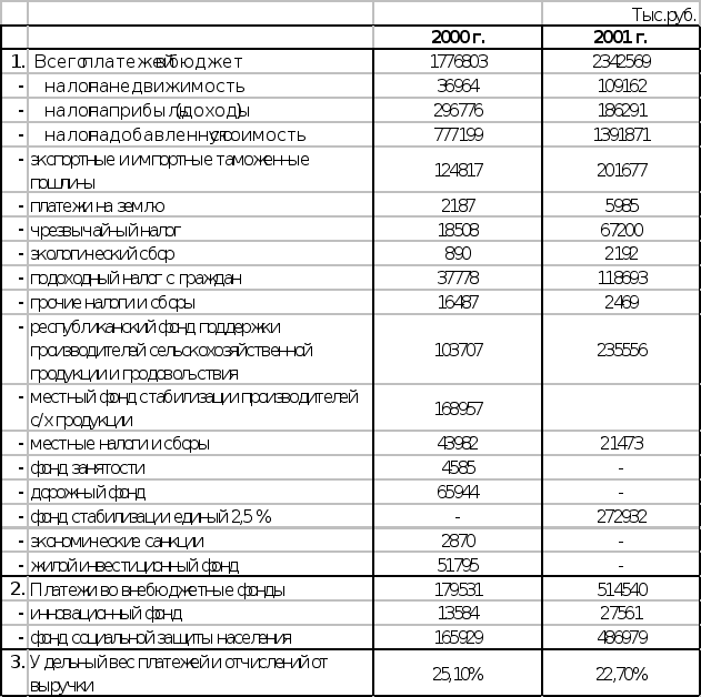 Удельный вес платежей и отчислений от выручки составил в 2000 г. 25, 1%, а в 2001 г. – 22, 7 %.
