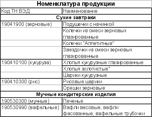В таблице 4.3.1. представлена номенклатура экспортируемой продукции по кодам ТН ВЭД.