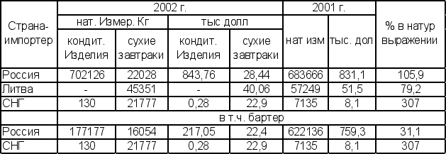 Значительную часть своей продукции кондитерский комбинат поставляет за рубеж. Основными странами-импортерами являются Россия и другие страны СНГ, а также Литва. Динамика экспорта продукции в денежном выражении и удельные вес экспорта представлены в таблице 4.2.3.