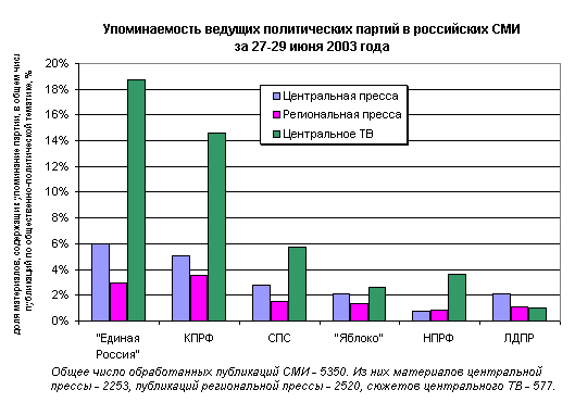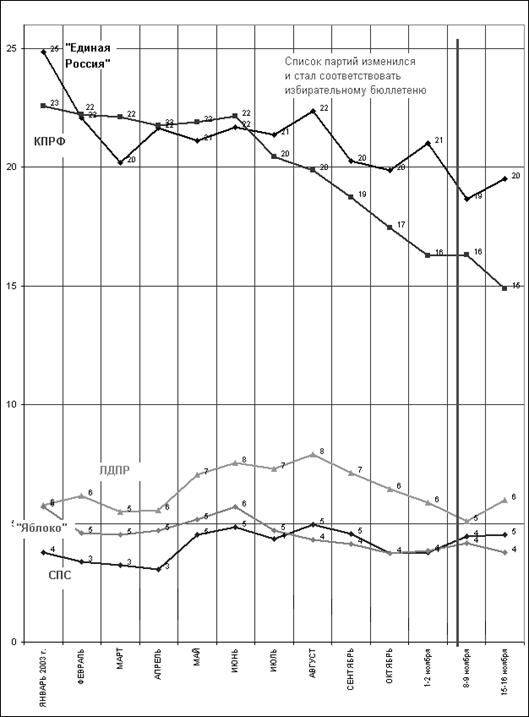 Свидетельством эффективности такой активной деятельности пресс-службы партии "Единая Россия" можно считать её рейтинг, в течении периода 3.10.03-10.11.03, согласно опросам ФОМ, поддерживающийся на уровне 20% (приложение 4).