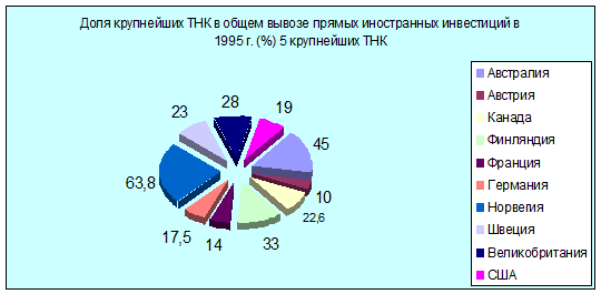Одно из главных направлений деятельности ТНК - вывоз капитала. Формами вывоза капитала являются прямые и портфельные инвестиции, а также займы и кредиты. Наиболее значимыми являются прямые инвестиции. Их глобальный объем возрос за период с 1982 по 1994 гг. в четыре раза; за этот же период доля глобальных прямых инвестиций удвоилась, достигнув 9% в общемировом ВВП. В 1996 г. объем прямых иностранных инвестиций в мире оценивался в 3,2 трлн. долларов. На протяжении прошедшего десятилетия (1986-1995 гг.) по темпам роста он обгонял валовые вложения в основной капитал более, чем вдвое, что свидетельствует об увеличивающейся интернационализации национальных систем производства.