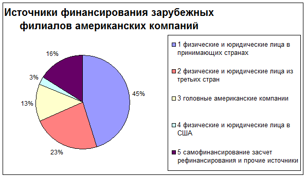 Источниками их финансирования выступают не только и не столько головные американские компании, сколько физические и юридические лица из принимающих третьих стран (см. диаграмма 3). Для этого зарубежные филиалы ТНК широко используют займы коммерческих и финансовых институтов принимающего государства и третьих стран, а не только стран базирования материнской компании;