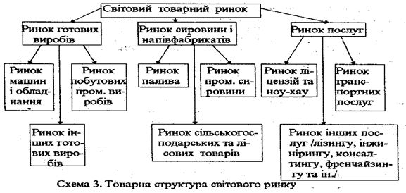 За товарно-галузевою структурою світового ринку відрізняють три провідних групи товарів - готові вироби, сировину і напівфабрикати, послуги (схема 3).