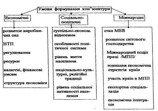 Умови формування кон ’ юнктури (УФК) - це зовнішнє середовище відносно КФФ, яке здатне впливати на КФФ. УФК можна поділити на три групи: економічні, соціально-політичні та міжнародні.