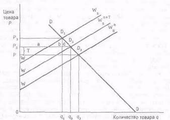 На графике линия WWs обозначает динамику предложения товара на мировом рынке до момента введения таможенного тарифа; линияWWsn -тенденцию предложения на рынке к моменту установления тарифа Т , когда поставщики, опасаясь потерять рынки, снизили цену на величину РР3 , превышающую величину тарифа Т ; линия WW sn + T предложение товара на рынке после установления тарифа. Параметры q1, q2, q3 показывают соответствующее количество приобретенного товара, а линия DDi — потребность в импортном товаре, изменяющаяся в зависимости от цены.