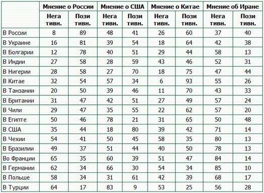 Таблица 1. - Мнение о России, США, Китае и Иране в разных странах мира в 2008 г. (%)[5]