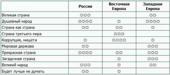 Опрос показал, что среди студентов из России, Западной и Восточной Европы образ России значимо ассоциируется с коррупцией и бедностью, при этом подобная ассоциация особенно распространена среди студентов из Восточной Европы, что коррелирует с тем обстоятельством, что именно учащиеся ВУЗов из Восточной Европы причисляют нашу страну к третьему миру (см. табл. 2):