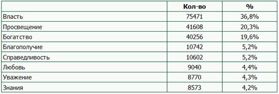 Исследование имиджа России в прессе США показало, что американские журналисты рассматривают нашу страну сквозь призму политики и экономики, видя в ней, прежде всего, ядерную и энергетическую державу. Точно так же освещается страна, которая является врагом США — Иран. В то же время в статьях о союзнике США Великобритании преобладают материалы об обществе, культуре, жизни людей и т.п.. Результаты анализа частоты встречаемости смысловых категорий Ценностного словаря Лассуэлла в текстах статей о России изданий New York Times, Wall Street Journal и U.S. Today, отраженные на диаграмме 3, свидетельствуют о значительном доминировании категорий “Власть”, “Просвещение” и “Богатство” в поле контента трех анализируемых газет (см. табл. 3 ):