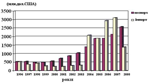 Рис.1 Динаміка зовнішньої торгівлі товарами Полтавської області у 1996 – 2008 роках (побудована за даними [ 4 ])