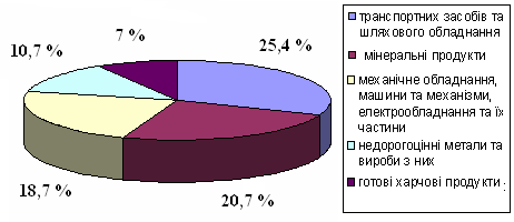 Вагоме місце в експорті товарів займає харчова промисловість. Так, ЗАТ «Домінік» здебільшого зосереджує свою роботу з країнами СНД; ЗАТ «Миргородський завод мінеральних вод» експортує товари в Ізраїль, Росію, Литву, Латвію, Грузію. Група компаній IDS Group (до якої належить ЗАТ «Миргородський завод мінеральних вод») є частиною міжнародної компанії IDS Borjomi International, яка є одним з трьох найбільших представників на ринку мінеральних вод СНД та Прибалтики, лідер в категорії природних бутильованих вод. На сьогоднішній день до IDS Borjomi International входять: IDS Borjomi Georgia (Грузія), IDS Group (Україна), IDS Borjomi Russia (Росія), IDS Borjomi Europe (Литва). IDS Group (Україна) має збалансований портфель популярних мінеральних вод, що видобуваються в екологічно чистих курортних регіонах України і представлені на ринку торговими марками «Моршинська», «Миргородська», «Трускавецька Аква-Еко», «Трускавецька кришталева», «Старий Миргород», «Сорочинська». Товарна структура імпорту має наступний вигляд: 1) 25,4% - поставки транспортних засобів та шляхового обладнання; 2) 20,7 % – мінеральні продукти; 3) 18,7 % – механічне обладнання, машини та механізми, електрообладнання та їх частини;4) 10,7 % – недорогоцінні метали та вироби з них; 5) 7,0 % – готові харчові продукти. (рис.2)