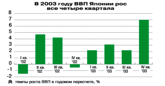 После кризиса середины 90-х годов в 2003 году ситуация в Японии улучшилась. За последние три месяца 2003 г. экономика Японии показала Феноменальный для этой страны рост – 7% в годовом исчислении. (Рисунок 1)Таких темпов здесь не видели с 1980-х. Суммарный рост ВВП Японии составил в 2003 году 2,7%. Это несколько ниже, чем в США (3,2%), но выше, чем в Великобритании (2,1%), Канаде (1,7%) и тем более в зоне евро (0,5%). В последнем квартале со своими 7% японцы обогнали американцев (в США – всего 4%).