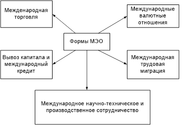 Международные экономические отношения на современном этапе представляют собой обширный комплекс торговых, производственных, научно-технических, финансовых связей между государствами, приводящих к обмену экономическими ресурсами, совместной экономической деятельности. Они в основном утвердились и реализуются в следующих основных формах (схема 1).