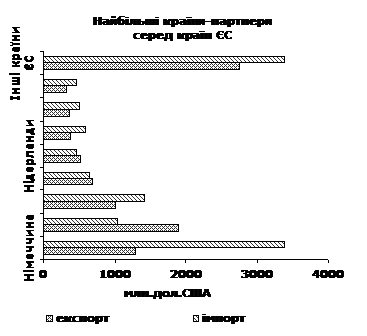 Наибольшие объемы экспортных поставок украинских товаров осуществлялись в Российскую Федерацию (37,7% от общего объема экспорта), Великобританию (6%), США (4,9%), Кипр (4,5%), Германию (4,2%), Польшу (1,2%). [21]