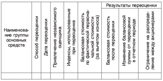 По результатам переоценки основных средств необходимо раскрывать следующую информацию, объединенную нами в отдельную таблицу.